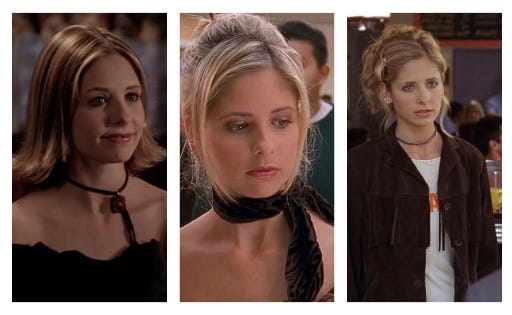 Buffy’s choker game was so of the moment and incredibly influential. She often paired them with tank tops, spaghetti strap dresses or off the shoulder tops, letting the jewelry stand out without overpowering her ootd.